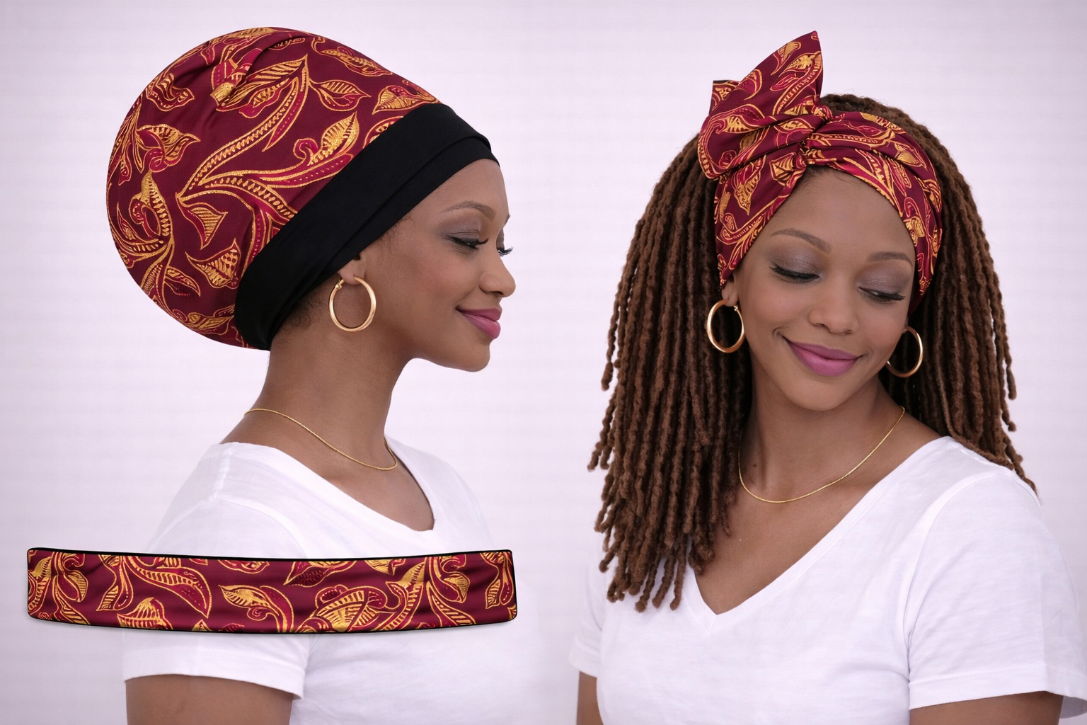 bonnet foulard cheveux longs 2 pièces – rose bordeaux et or cuivré