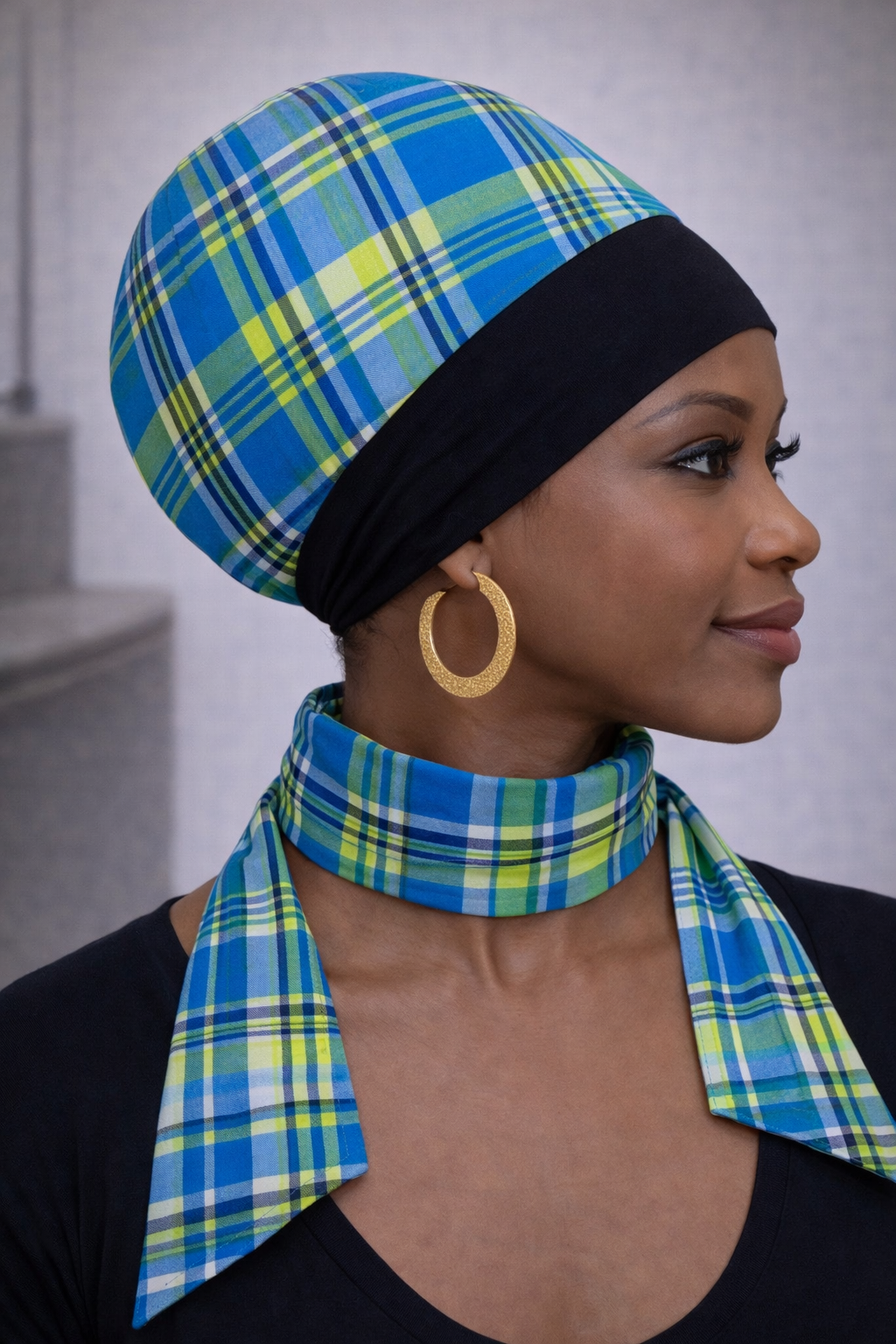 Bonnet madras bleu+ bandeau flexible spécial cheveux courts avec rembourrage intégré