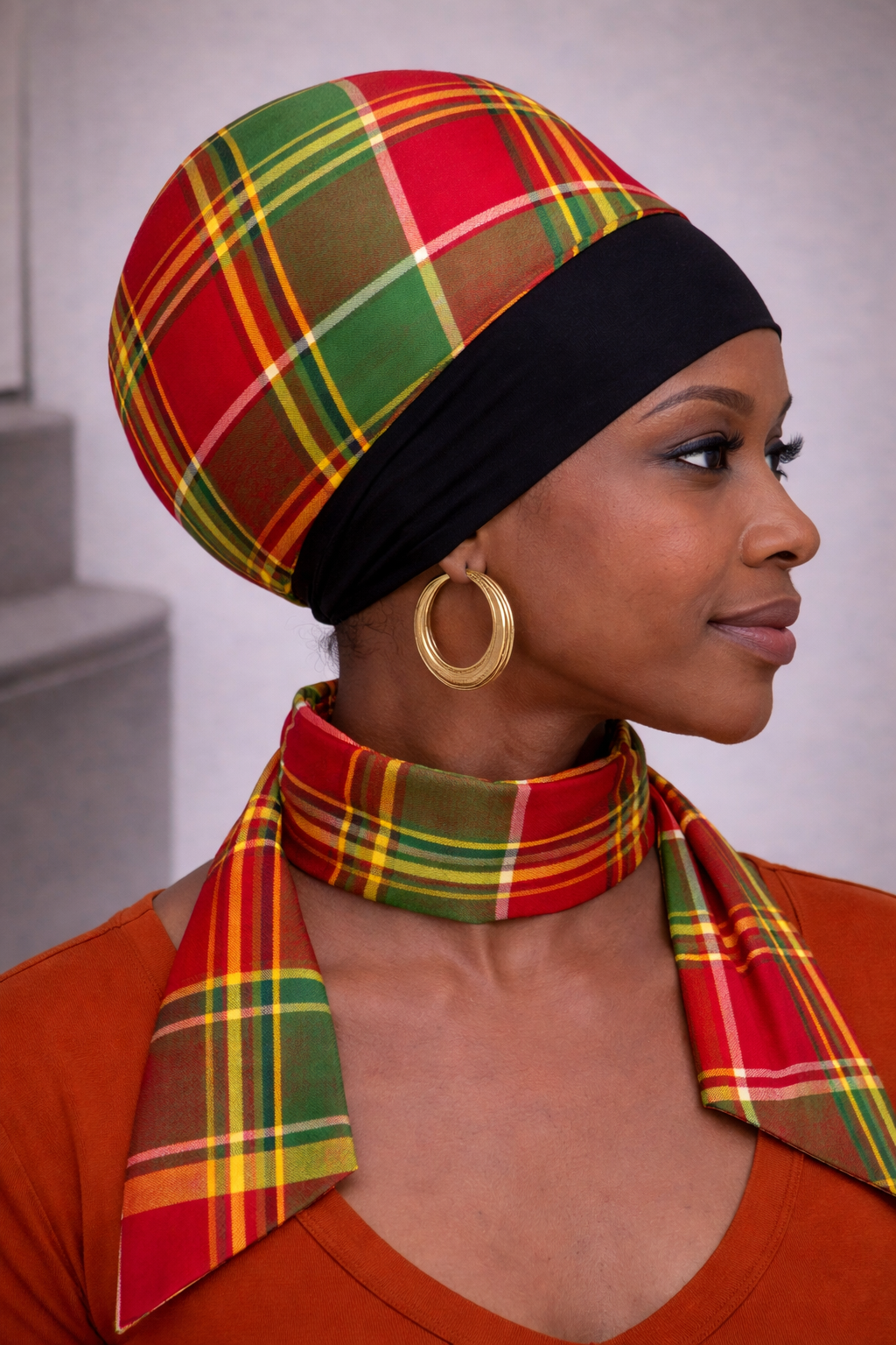 Bonnet madras rouge+ bandeau flexible spécial cheveux courts avec rembourrage intégré