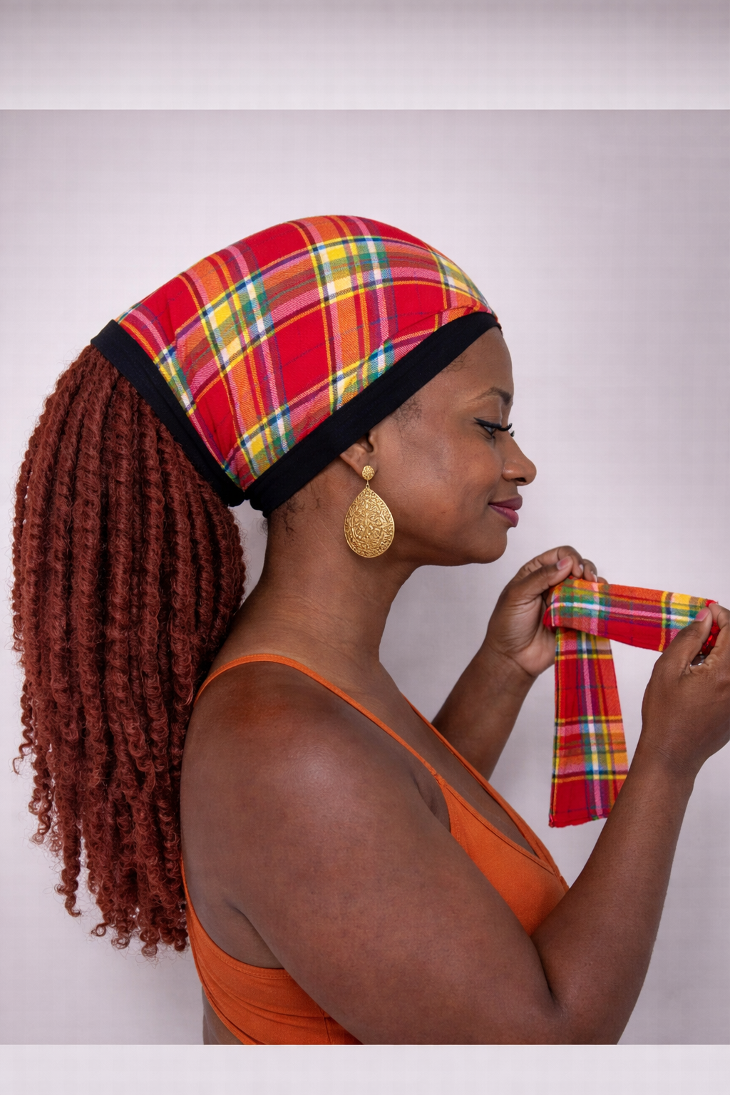 Bonnet ouvert cheveux longs madras rouge avec bandeau flexible