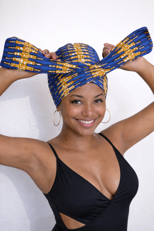 foulard cheveux courts avec rembourrage intégré couleur bleu et moutarde