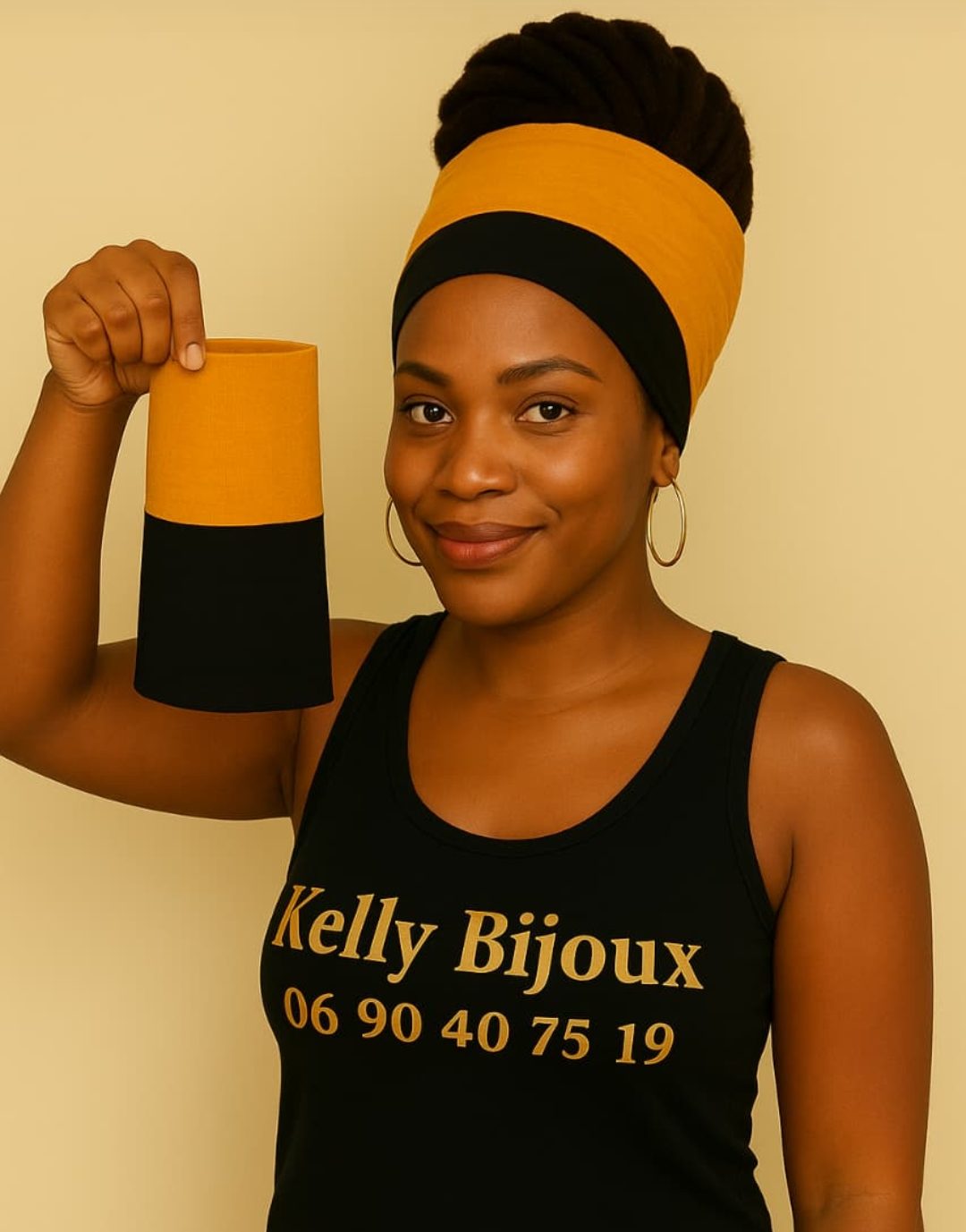 Pour encore  plus de style, le foulard tu peut être porté avec  un bandeau flexible par dessus, afin de structurer la coiffure et personnaliser le rendu.
